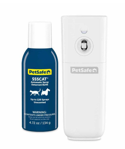 Automatisk träningsspray för husdjur. Känner av när husdjuret är i närheten och avger en avskräckande men för människor luktfri spray. Tränar husdjuren att hålla sig borta från vissa områden och även att sluta klösa exempelvis på möbler.