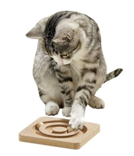 Robust spelbräda av trä. Lägg några godisbitar i spåren för att motivera katten ytterligare.